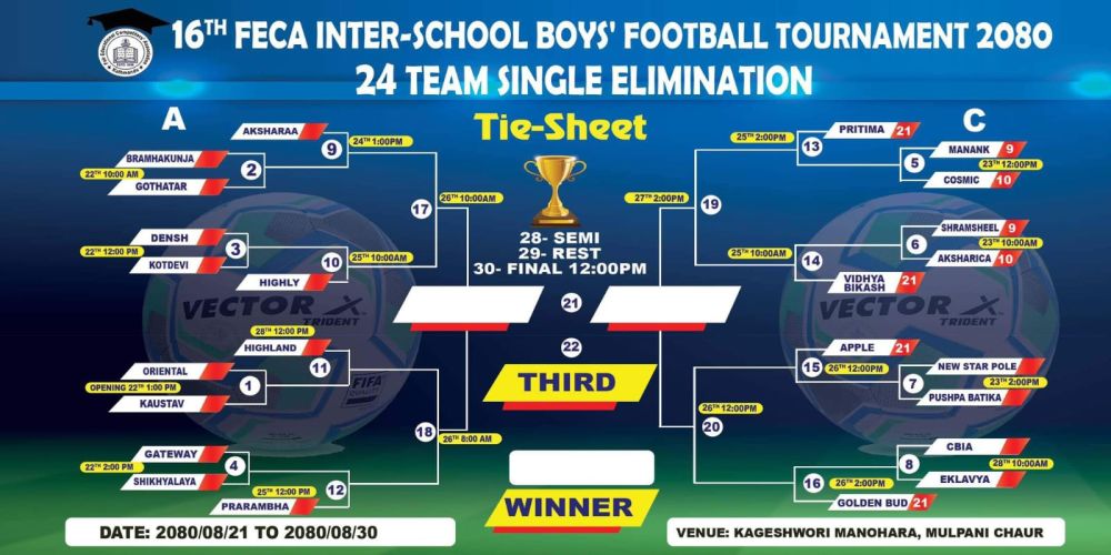 विगत १५ वर्ष अगाडि देखि पेप्सीकोला फुटबल चौरमा हुँदै आएको फेका प्रतियोगिता यस वर्ष मुलपानी फुटबल चौरमा हुने भएको छ । विद्या विकास स्कुल, गोठाटारका प्रधानाध्यापक एबम् फेकाका अध्यक्ष श्रीराम दाहालका अनुसार १६ औं खेल यही मङसिर २१ देखि ३० गतेसम्म मुलपानी फुटबल चौरमा चल्ने जानकारी दिए । खेलमा २४ टिम सहभागी हुनेछन भने फाइनल खेल ३० गते हुने अध्यक्ष दाहालले जानकारी दिए। २४ टिम मध्य प्रतिस्पर्धामा पहिलो, दोश्रो र तेश्रो हुने टिम लाई क्रमश: रु. २००००/-, १००००/- र ५०००/- धन राशी पुरस्कारका साथै ट्रफी तथा प्रमाण पत्र र चौथो हुने टिमलाई ट्रफी तथा प्रमाण पत्र प्रदान गरिने छ । उनका अनुसार फेकाले वार्षिक २० वटा कार्यक्रम गर्दै आएको छ।