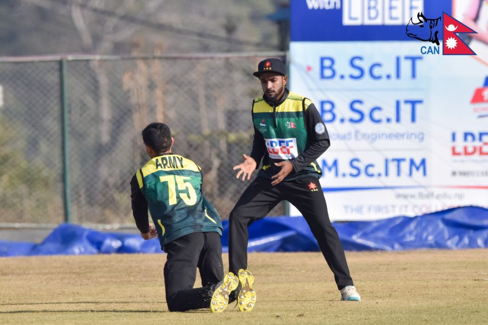 आर्मीका साहब आलम एक्लैले ६ विकेट लिए । कुशल मल्लले दुई तथा सोमपाल कामी र विवेक यादवले समान एक/एक विकेट लिए ।।