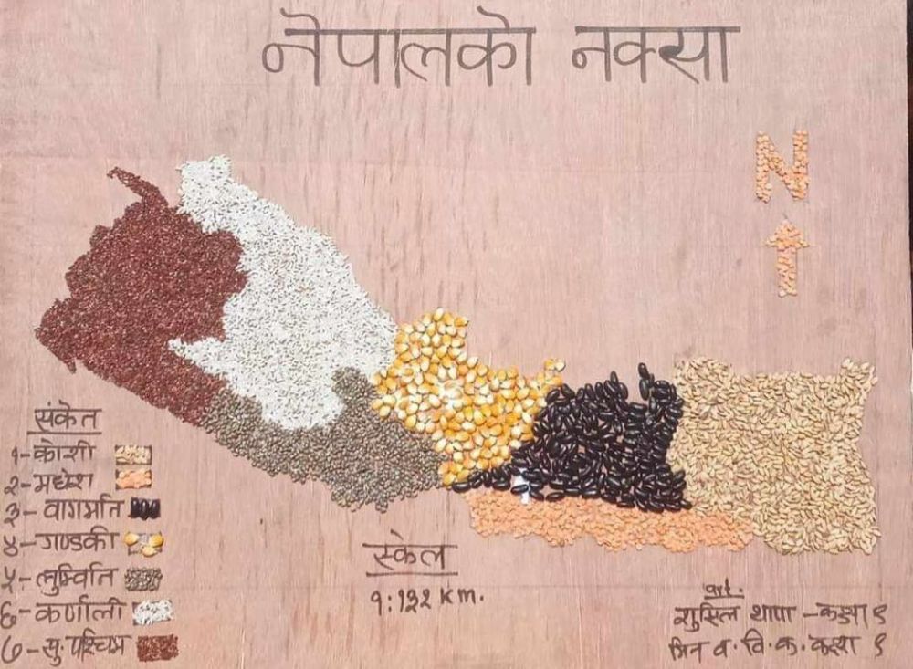 गुल्मी, माघ ६ गते । गुल्मीका विद्यार्थीले स्थानीय स्तरमा पाइने दलहन र खाद्यान्न बालीको दाना प्रयोग गरी आकर्षक नेपालको नक्सा बनाएका छन् । जिल्लामा पाइने रैथाने बाली अन्तर्गत धान, मकै, गहुँ, कोदो, कालो सिमी र भाँगोको दाना प्रयोग गरी नक्सा तयार पारेका हुन् ।