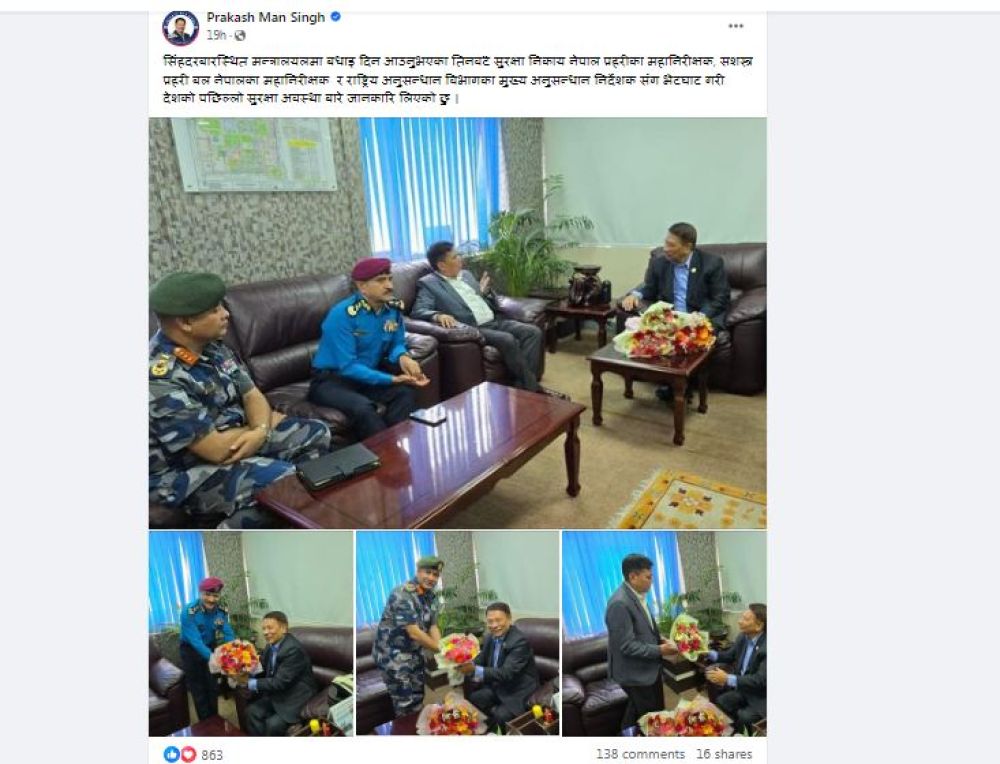 ‘सिंहदरबारस्थित मन्त्रालयलमा बधाइ दिन आउनुभएका तिनवटै सुरक्षा निकाय नेपाल प्रहरीका महानिरीक्षक, सशस्त्र प्रहरी बल नेपालका महानिरीक्षक र राष्ट्रिय अनुसन्धान विभागका मुख्य अनुसन्धान निर्देशक संग भेटघाट गरी देशको पछिल्लो सुरक्षा अवस्था बारे जानकारि लिएको छु ।’ मन्त्री सिंहले लेखेका छन् ।