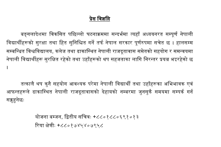 ‘बंगलादेशमा विकसित पछिल्लो घटनाक्रममा सन्दर्भमा त्यहाँ अध्ययनरत सम्पूर्ण नेपाली विद्यार्थीहरूको सुरक्षा तथा हित सुनिश्चित गर्ने तर्फ नेपाल सरकार पूर्णरुपमा सचेत छ,’ विज्ञप्तिमा भनिएको छ,‘हालसम्म सम्बन्धित विश्वविद्यालय, कलेज तथा ढाकास्थित नेपाली राजदूतावास समेतको सहयोग र समन्वयमा नेपाली विद्यार्थीहरू सुरक्षित रहेको तथा उहाँहरूको थप सहजताका लागि निरन्तर प्रयत्न भइरहेको छ ।’