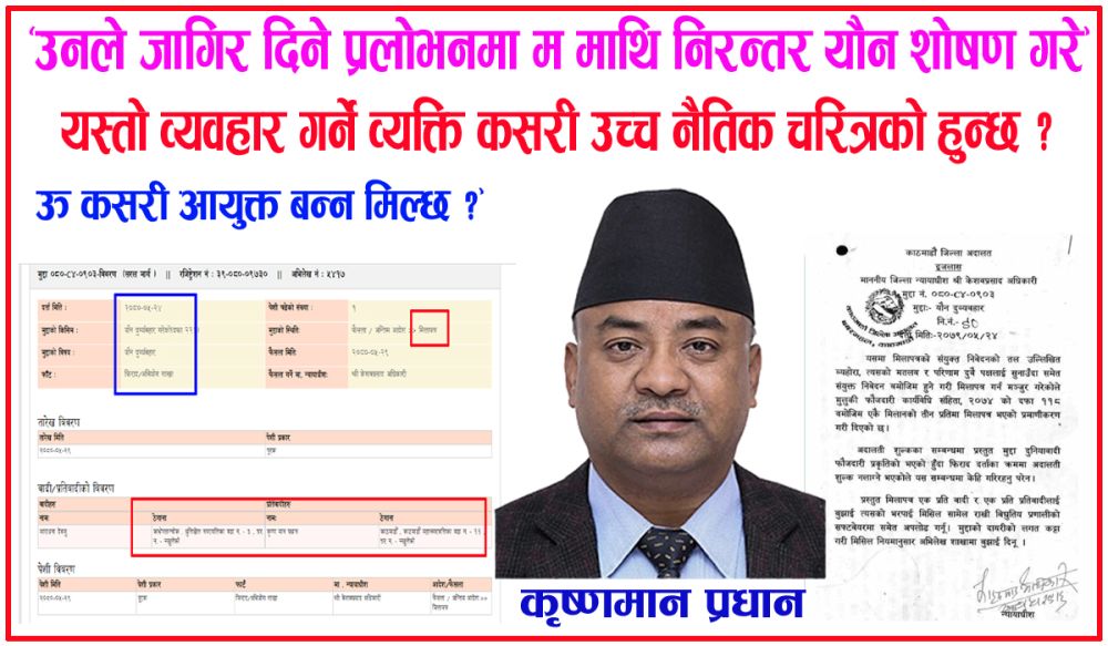 काठमाडौं । कानूनी राज्यमा कानूनकै धज्जी उडाएर पैसा र पावरको आडमा खुलेआम अपराध गर्दै हिँड्ने तथा यौन हिंसाको आरोप लागेका प्रस्तावित निर्वाचन आयुक्त कृष्णमान प्रधानले संसदीय सुनुवाइ समितिबाट आफ्नो नियुक्ति अस्वीकृत हुने त्रासले आफैंले नाम फिर्ता लिएका छन् ।