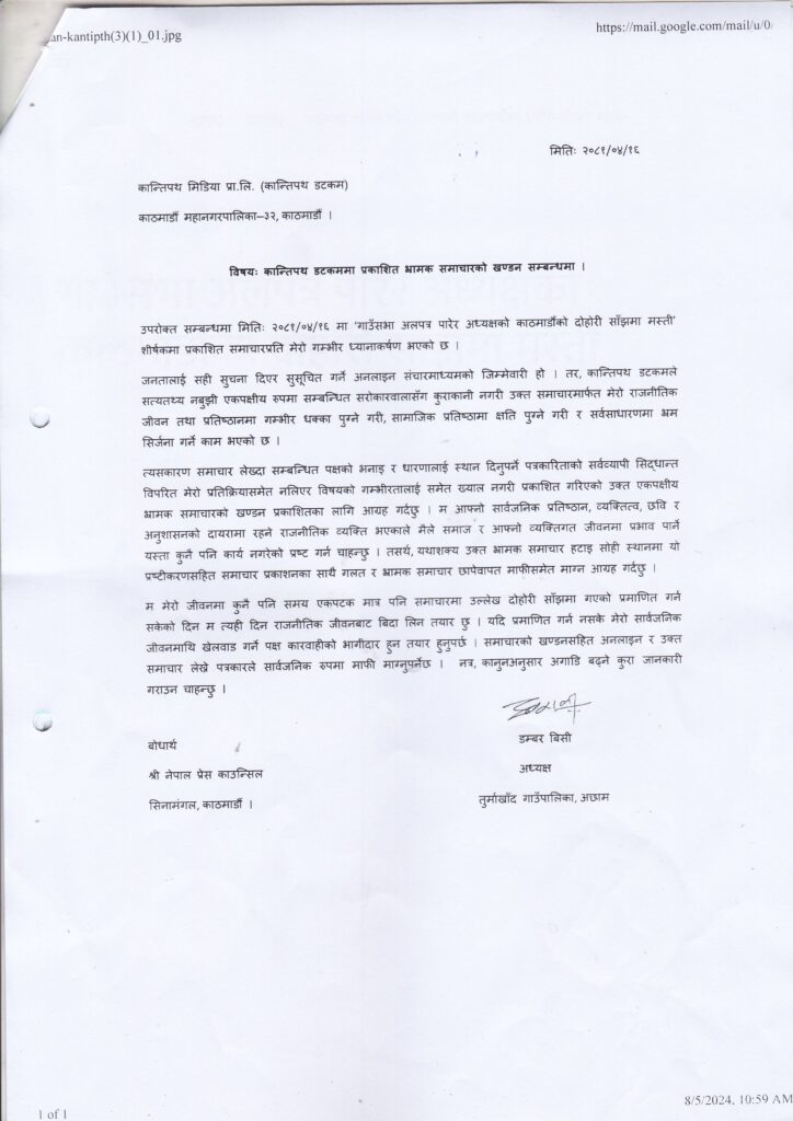 काठमाडाैं । अछामको तुर्माखाद गाउँपालिकाका अध्यक्ष डम्बर बिसीले कान्तिपथ डटकम अनलाइनमा प्रकाशित समाचारप्रति आपत्ति जनाउँदै खण्डन गर्नुभएकाे छ ।