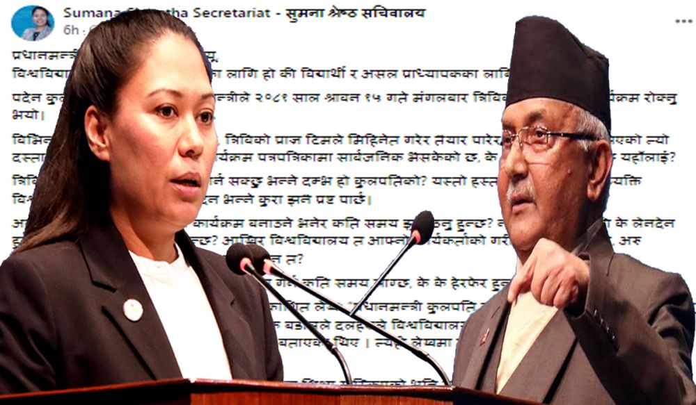 काठमाडौं । पूर्व शिक्षामन्त्री सुमना श्रेष्ठले त्रिविको नीति तथा कार्यक्रम रोकेको भन्दै प्रधानमन्त्री केपी शर्मा ओलीले आक्रोश व्यक्त गरेकी छिन्।