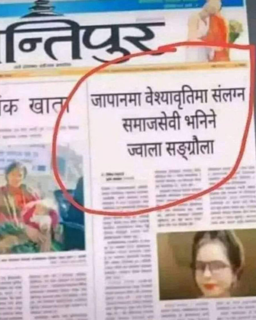 ‘धेरैको लागि सहयोग गरियो, दुःख गरियो, अन्याय अत्याचारविरुद्द बोलियो, तर अन्त्यमा सामाजिक सञ्जाल चलाउने केही दानवीय प्रवृत्तिका मान्छेहरुले मलाई ‘वेश्या’ भनेर फेसबुकभरि फेक एडिट गरिएको कान्तिपुर कुदाएर बदनाम गर्ने कोसिस गरे । यो कुरा चारपाँच वर्षअघिकै हो । म जापान रहँदा केही व्यक्तिहरुसँग वैचारिक ठाकठुक परेको थियो । विचारलाई विचारले नै जित्न सकिन्थ्यो, तर वैचारिक बहस गर्न नसक्नेहरुले कान्तिपुरले छापे जस्तै दुरुस्त फोटो र केही अक्षर नचिनिने गरी फेक एडिट गरेर ‘समाजसेवी भनिने ज्वाला संग्रौला वेश्यावृत्तिमा सम्लग्न’ भनेर एडिट गर्दै सञ्जालभरि घुमाए र मलाई ‘जापान काण्ड’ भन्दै जताततै ट्याग मेन्सन गरेर चरित्र हत्या गर्दै मेरो बदनाम गरी मलाई मानसिक रुपमा विक्षिप्त बनाए । उस्तै भए मेरो पनि श्रीशा कार्कीको जस्तै समाचार आउँथ्यो, तर मैले हिम्मत हारिनँ । मैले गलत कुराको विरुद्ध लड्नुपर्छ भन्ने सोचेर नेपाल आएँ । मलाई पत्रिकाले नलेखेको कुरालाई लेखे जस्तै गरेर बदनाम गर्नेहरुको विरुद्ध म साइबर धेरै पटक गएँ, तर प्रहरीले मलाई कुनै दिन सहयोग गरेन । अहिले पनि मेरोबारे यस्तो भ्रम फिजाउन छोडेका छैनन् । चरित्र हत्या गरेर वेश्या बनाउन छोडेका छैनन् । हुँदाहुँदा हिजो दुर्गा प्रसाईंले समेत जापानकी वेश्या, पार्टीकी केन्द्रीय सदस्य, रातभरि चर्ने, अरुलाई पनि केटा मिलाउने भन्दै एउटा युटुबेलाई अन्तर्वार्ता दिएका छन् । यदि नेपाली समाज र नेपालको न्याय ज्युँदै छ भने अराजक दुर्गा प्रसाईंलाई कानूनी रुपमा दण्डित गरेर मलाई न्याय दिन्छ कि अर्को श्रीशा बन्न बाध्य बनाउँछ ? दुर्गा प्रसाईंले के सोचेर कसैकी छोरी-चेलीलाई वेश्या-रण्डी भन्दैछन् ? के उनी महिलाको गर्भबाट जन्मिएका होइनन् ? राज्यले यसको जवाफ खोज्न ढिला नगरोस् !’