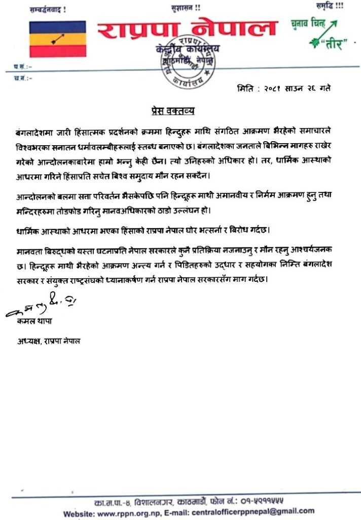 विज्ञप्तिमा उनले भनेका छन् : ‘आन्दोलनको बलमा सत्ता परिवर्तन भैसकेपछि पनि हिन्दूहरूमाथि अमानवीय र निर्मम आक्रमण हुनु तथा मन्दिरहरुमा तोडफोड गरिनु मानव अधिकारको ठाडो उल्लंघन हो। धार्मिक आस्थाको आधारमा भएका हिंसाको राप्रपा नेपाल घोर भत्सर्ना र विरोध गर्दछ।’