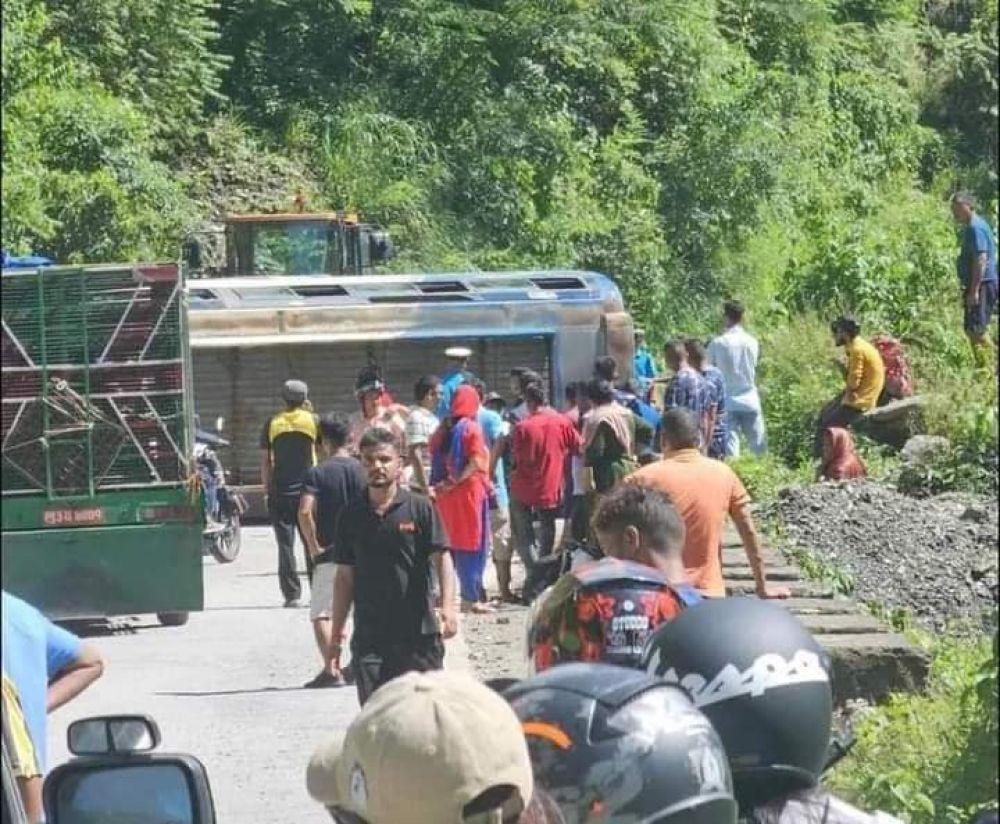 अचानक बसमाथि ढुंगा खसेपछि चालक आत्तिँदा बस अनियन्त्रित भएर पल्टिएको हो ।
