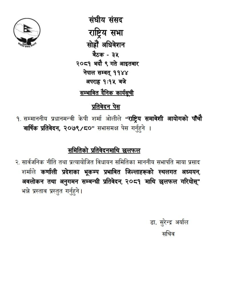 त्यसैगरी बैठकमा सार्वजनिक नीति तथा प्रत्यायोजित विधायन समितिका सभापति माया प्रसाद शर्माले कर्णाली प्रदेशका भूकम्प प्रभावित जिल्लाहरूको स्थलगत अध्ययन, अवलोकन तथा अनुगमन सम्बन्धी प्रतिवेदन, २०८१ माथि छलफल गरियोस् भन्ने प्रस्ताव प्रस्तुत गर्ने कार्यसूची रहेको कार्यसूचीमा उल्लेख छ ।