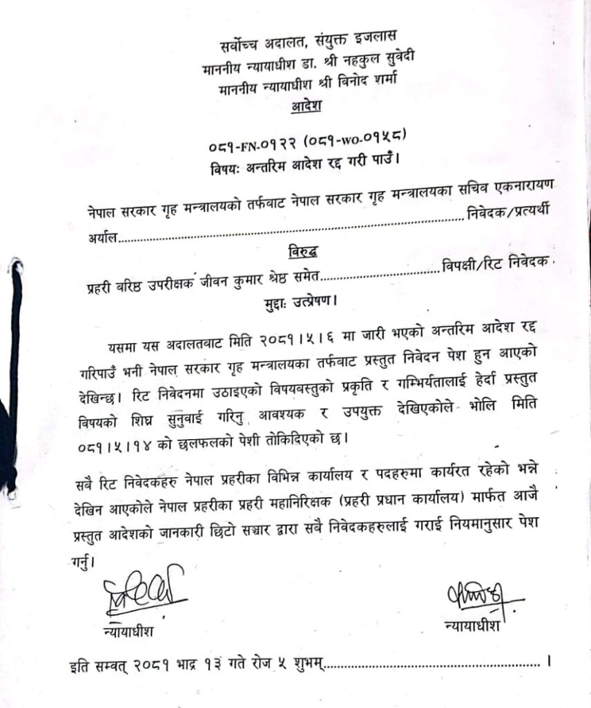 एसएसपी जीवन श्रेष्ठसहितका प्रहरी अधिकृतहरुले दिएको रिट निवेदनमा सर्वोच्चका न्यायाधीश हरि फुँयालले दिएको आदेशको विरुद्धमा सरकार भ्याकेटमा गएको थियो ।