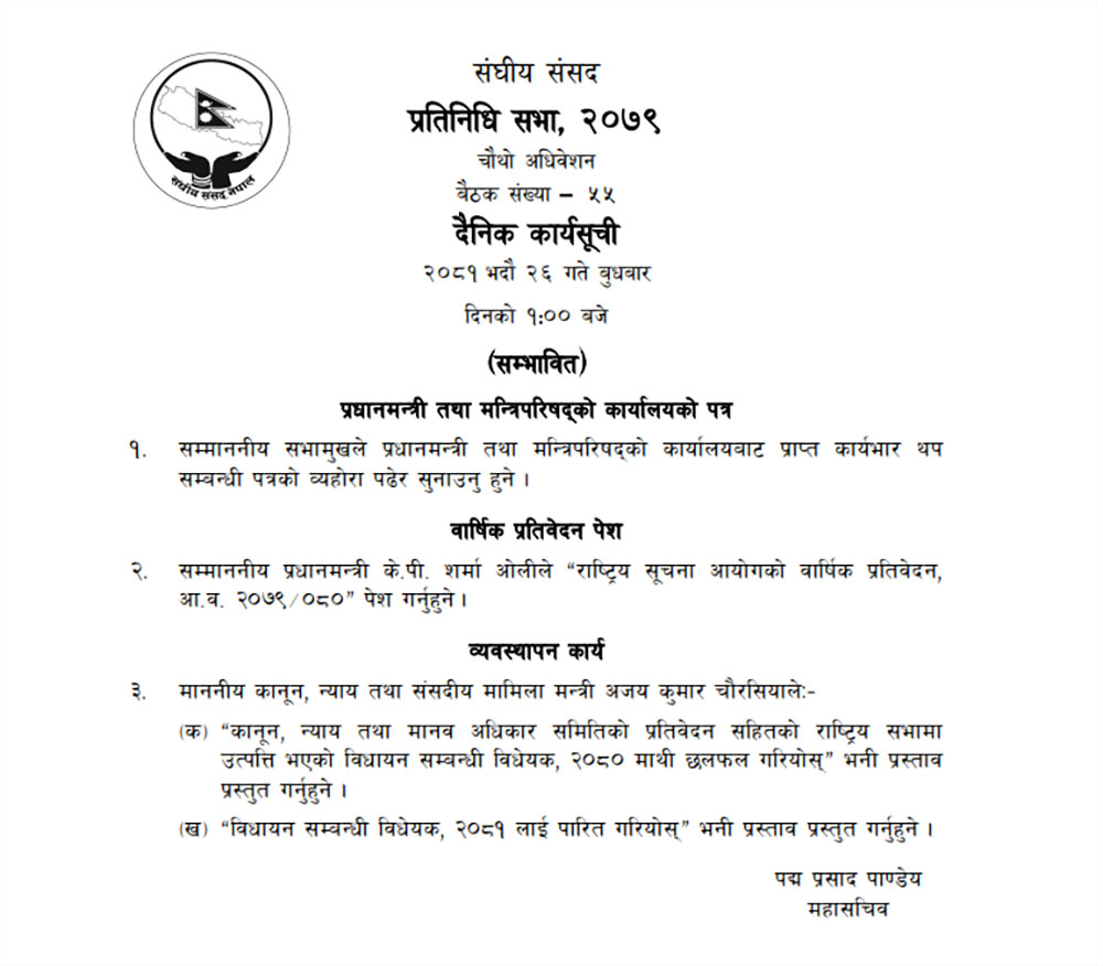 आजको बैठकमा प्रधानमन्त्री तथा मन्त्रिपरिषद्को कार्यालयको पत्र पढेर सुनाउने, बार्षिक प्रतिवेदन पेश गर्ने र व्यवस्थापन कार्य गर्ने कार्यसूची रहेको छ ।