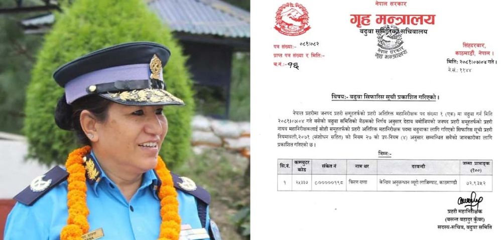 काठमाडौँ । प्रहरी नायब महानिरीक्षक (डिआइजी) किरण राणा प्रहरी अतिरिक्त महानिरीक्षक (एआइजी) पदमा बढुवाका लागि सिफारिस हुनुभएको छ ।