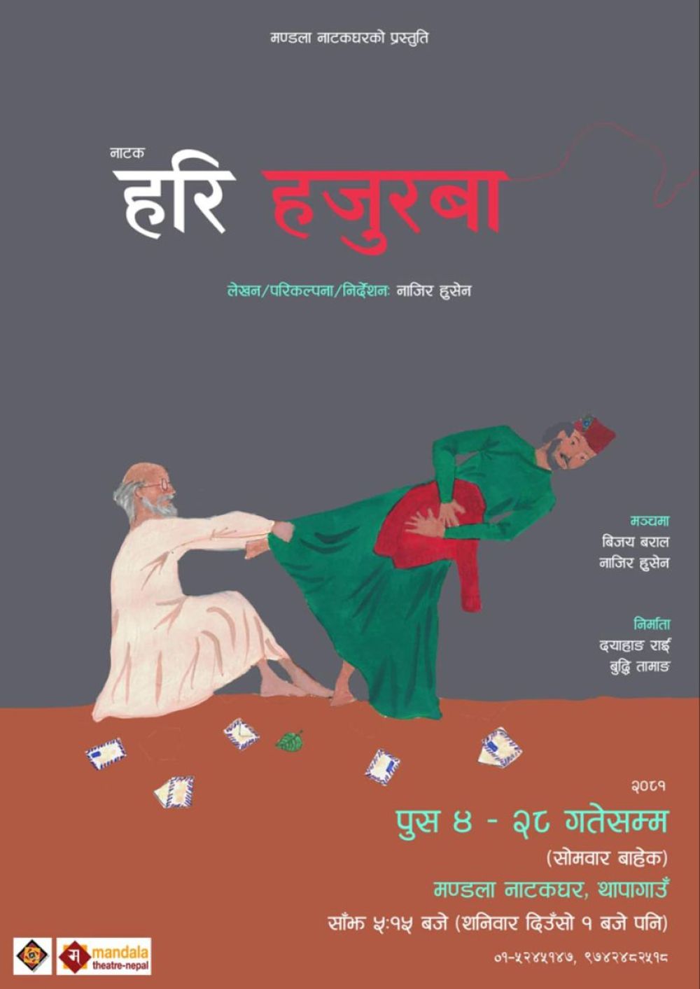 अभिनेता नाजिर हुसेनको लेखन, परिकल्पना तथा निर्देशनमा नाटक मञ्चन हुन लागेको हो । यसमा नाजिर स्वयंसहित अभिनेता विजय बराल देखिँदैछन् ।