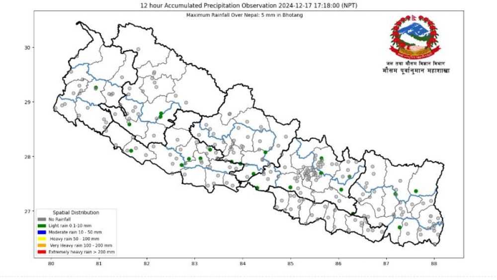 राती भने हिमाली र पहाडी क्षेत्रमा मुख्यतया सफा रहने सम्भावना रहेको छ । तराई क्षेत्रमा मुख्यतया सफा रहने सम्भावना रहेको छ ।