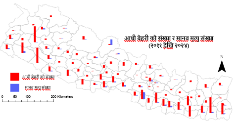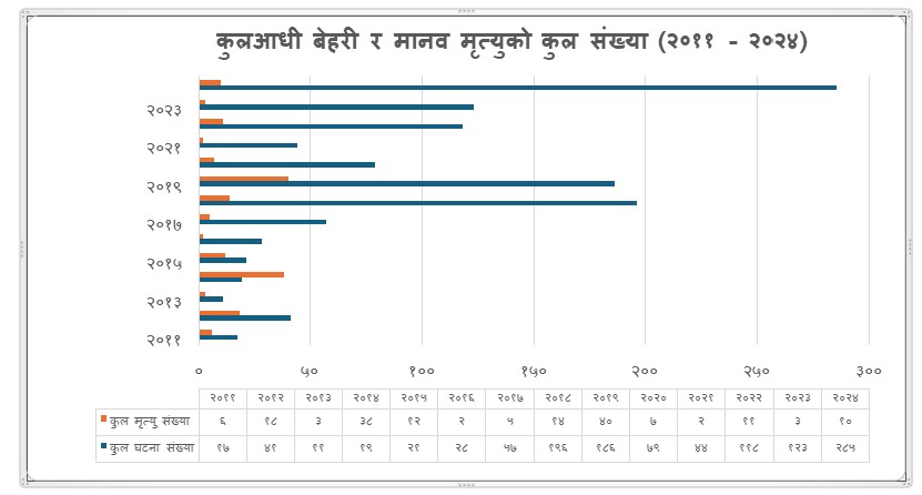 सबैभन्दा बढी आँधी बेहरीका घटना सन् २०२४ मा भएको देखिन्छ। यस वर्ष जम्मा २८५ घटना भएकोमा १० जनाको ज्यान गएको छ भने झन्डै आधा संख्याका आँधी बेहरीका घटना (१४६) रेकर्ड भएको वर्ष सन् २०१९ मा मात्रै ४० जनाको मृत्यु भएको थियो। त्यसैगरी, सन् २०१४ मा जम्मा १९ वटा घटना रेकर्ड भएकोमा ३८ जना मानिसको मृत्यु भएको थियो। यसरी हेर्दा कुल आँधी बेहरीका घटना संख्या र मानव मृत्युको अनुपात गणना नमिल्ने रहेछ। अर्थात्, थोरै घटनाबाट पनि धरै नोक्सान हुन सक्ने रहेछ।