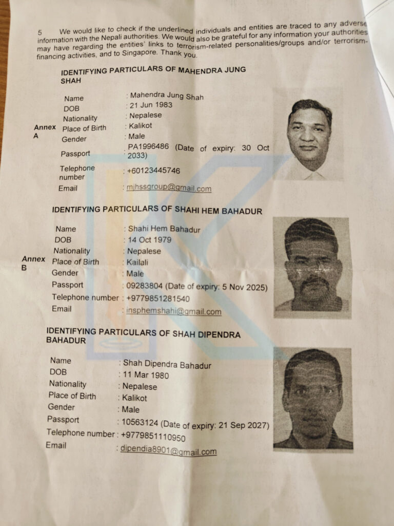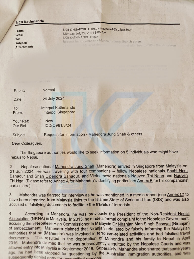 आतंकवादी क्रियाकलापमा संलग्न कालिकोटका महेन्द्रजंग शाहसँगको समूहसँग उनको निकटता देखिएको भन्दै इन्टरपोलको सिंगापुर शाखाले नेपाल प्रहरीलाई गत भदौमा पत्राचार गरेको थियो।