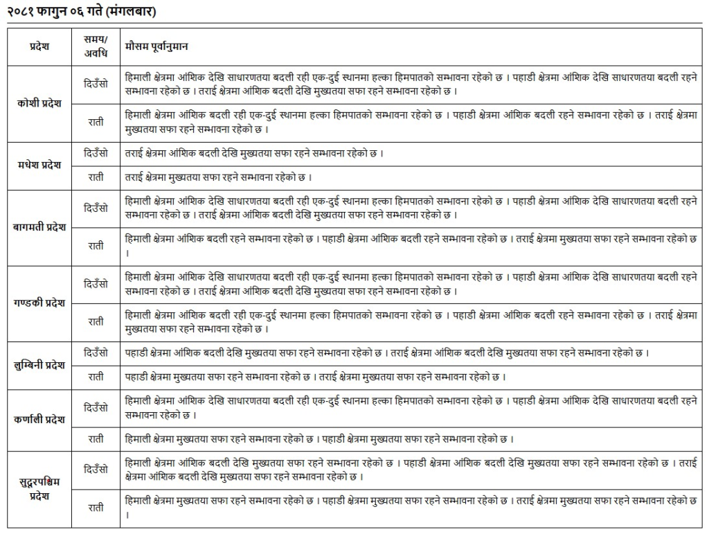 देशक उच्च पहाडी तथा हिमाली भूभागका थोरै स्थानमा हल्का हिमपातकोसमेत सम्भावना रहेको महाशाखाले सोमबार बिहान ६ बजे जारी गरेको बुलेटिनमा उल्लेख छ।