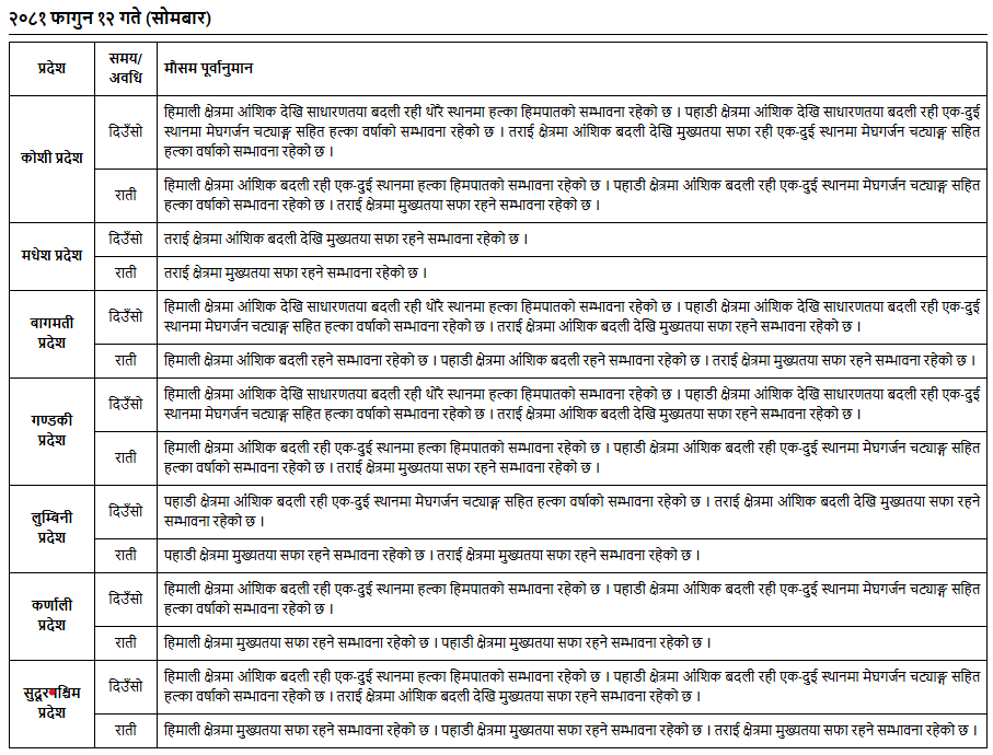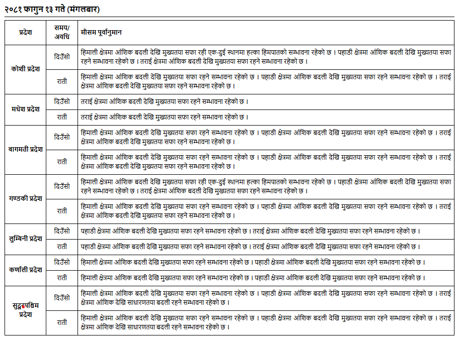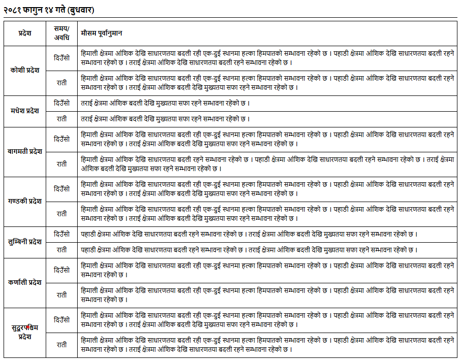 कोसी, बागमती र गण्डकी प्रदेशका उच्च पहाडी तथा हिमाली भूभागका थोरै स्थान तथा बाँकी प्रदेशका उच्च पहाडी तथा हिमाली भूभागका एकदुई स्थानमा आज हल्का हिमपातकोसमेत सम्भावना छ।