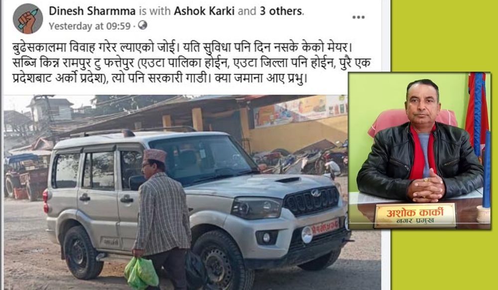 काठमाडौं । उदयपुरको वेलका नगरपालिकाका मेयर अशोक कार्कीले सरकारी गाडी दुरुपयोग गरेको पाइएको छ ।