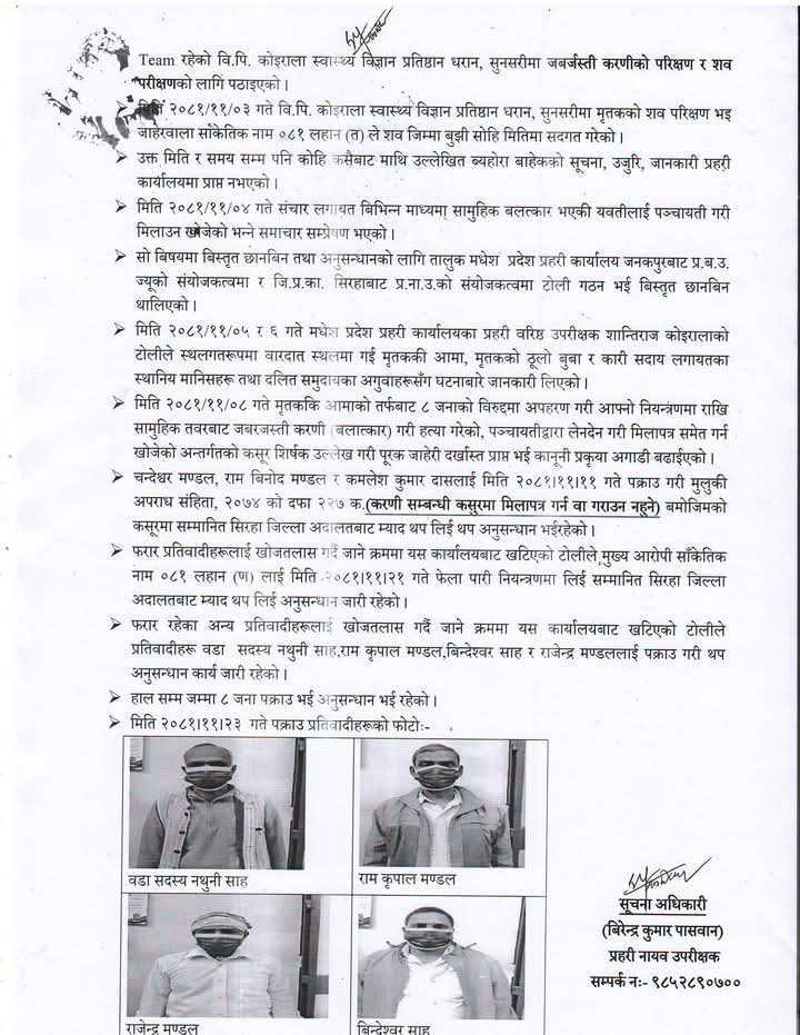 राजेन्द्र महतो, सिरहा। सिरहाको नवराजपुर गाउँपालिका- ०१ भगवतिपुरकी रिंकु कुमारी सदाको सामुहिक बलात्कार र शंकास्पद मृत्यु प्रकरणमा अहिले सम्म आठ जना पक्राउ परेका छन् ।