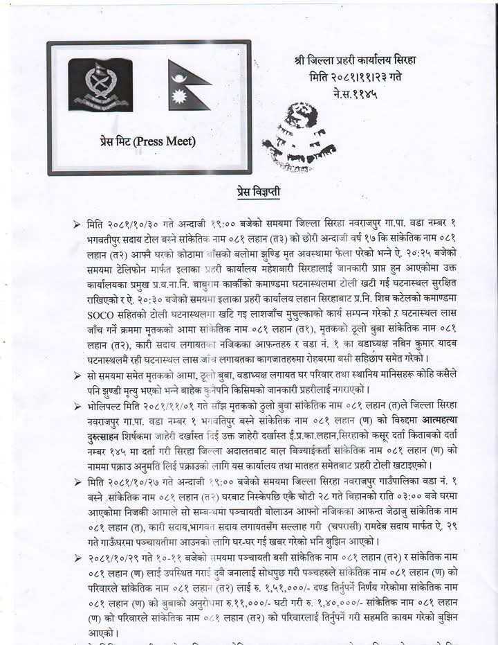 पक्राउ परेका व्यक्तिहरूलाई आज जिल्ला प्रहरी कार्यालय सिरहाले पत्रकार सम्मेलन गरी सार्वजनिक गरेका छ्न।
