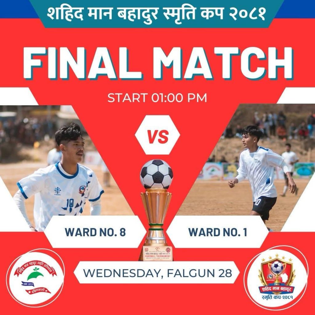 दक्षिणकालीमा जारी ‘शहीद मान बहादुर स्मृति कप २०८१’ को फाइनल खेल तथा समापन समारोह फागुन २८ गते बुधबार सम्पन्न हुने भएको छ। शहीद मानबहादुर स्मृति प्रतिष्ठानद्वारा आयोजित उक्त ९ ए साइड फुटबल लिग कम नकआउट प्रतियोगिताको फाइनल खेल वडा नं १ र वडा नं ८ टिमबीच हुने आयोजक समितिले जनाएको छ।
