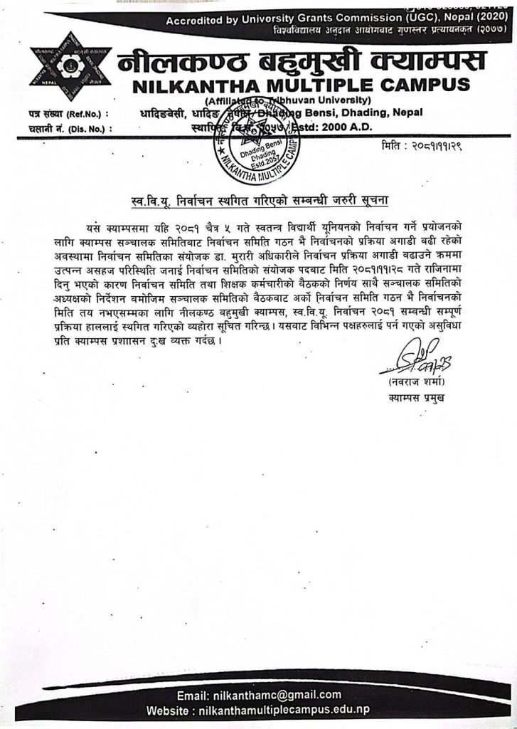 यही चैत्र ५ गते स्वतन्त्र विद्यार्थी युनियनको निर्वाचन गर्ने प्रयोजनको लागि क्याम्पस सञ्चालक समितिवाट निर्वाचन समिति गठन भै निर्वाचनको प्रक्रिया अगाडी बढी रहेको अवस्थामा निर्वाचन समितिका संयोजक मुरारी अधिकारीले निर्वाचन प्रक्रिया अगाडी बढाउने क्रममा उत्पन्न असहज परिस्थिति जनाई निर्वाचन समितिको संयोजक पदबाट फागुन २८ गते राजिनामा दिनुभएको कारण निर्वाचन समिति तथा शिक्षक कर्मचारीको बैठकको निर्णय साथै सञ्चालक समितिको अध्यक्षको निर्देशन बमोजिम सञ्चालक समितिको बैठकबाट अर्को निर्वाचन समिति गठन भई निर्वाचनको मिति तय नभएसम्मका लागि नीलकण्ठ बहुमुखी क्याम्पस, स्ववियु निर्वाचन २०८१ सम्बन्धी सम्पूर्ण प्रक्रिया हाललाई स्थगित गरिएको ब्यहोरा सूचित गरिन्छ ।