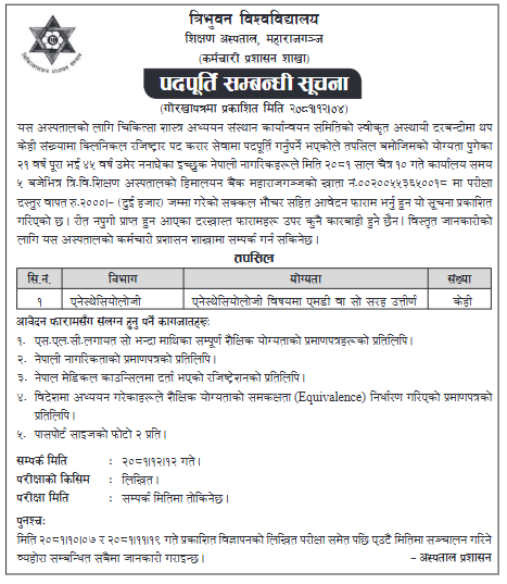यसका लागि योग्यता पुगेका २१ वर्ष पूरा भई ४५ वर्ष उमेर ननाघेका इच्छुक नेपाली नागरिकले चैत १० गतेभित्र त्रिवि शिक्षण अस्पतालको हिमालयन बैंक (महाराजगन्ज) को खाता नं.००२००५५३६५००१८ मा परीक्षा दस्तुरबापत २ हजार रुपैयाँ जम्मा गरेको सक्कल भौचरसहित आवेदन फाराम भर्न सकिने सूचनामा उल्लेख छ।