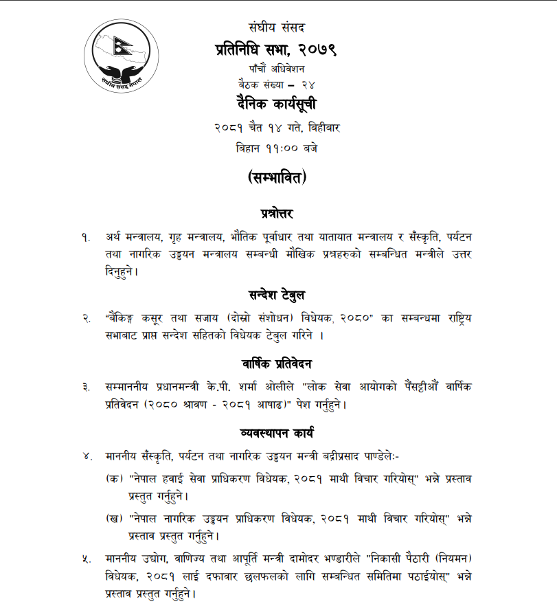 यस्तो छ प्रतिनिधि सभा बैठकको सम्भावित कार्यक्रम-