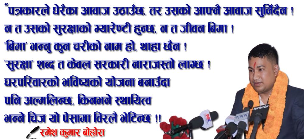 पत्रकारले धेरैका आवाज उठाउँछ, तर उसको आफ्नै आवाज सुनिँदैन । न त उसको सुरक्षाको ग्यारेण्टी हुन्छ, न त जीवन बिमा । ‘बिमा’ भन्नु कुन चरीको नाम हो, थाहा छैन । ‘सुरक्षा’ शब्द त केवल सरकारी नाराजस्तो लाग्छ । घरपरिवारको भविष्यको योजना बनाउँदा पनि अल्मलिन्छ, किनभने स्थायित्व भन्ने चिज यो पेसामा विरलै भेटिन्छ ।