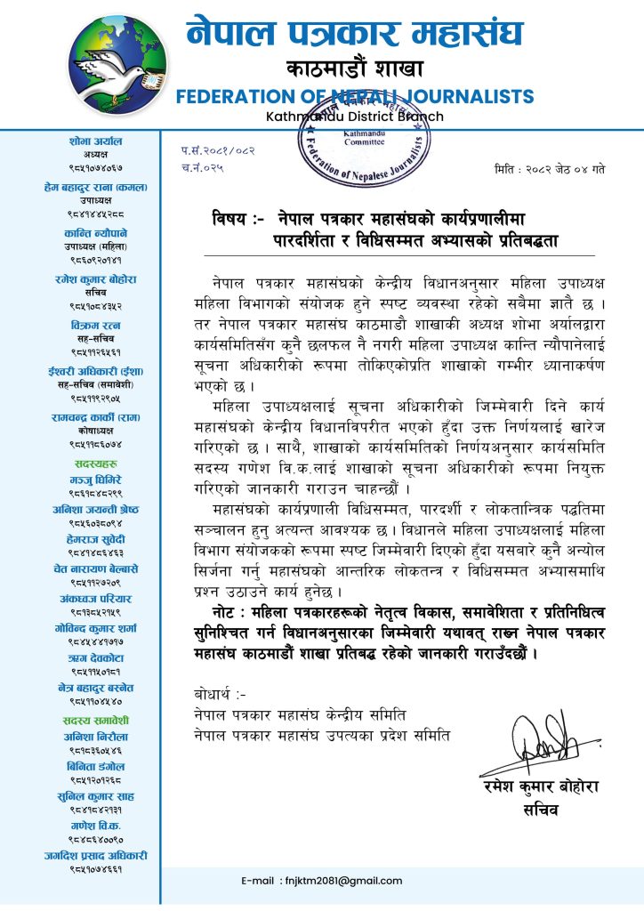 शाखाले जारी गरेको विज्ञप्तिमा भनिएको छ, “महिला उपाध्यक्षलाई सूचना अधिकारीको जिम्मेवारी दिने कार्य महासंघको केन्द्रीय विधानविपरीत भएको हुँदा उक्त निर्णय खारेज गरिएको छ।”