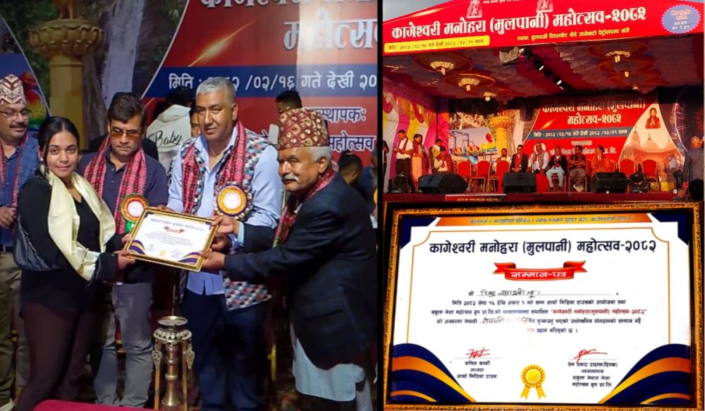 काठमाडाैं । कागेश्वरी मनोहरा नगरपालिका–७ स्थित मुलपानीमा आयोजित “कागेश्वरी मनोहरा (मुलपानी) महोत्सव–२०८२” को अवसरमा पत्रकार टीका रसाइली नेपाली पत्रकारिता क्षेत्रमा पुर्याएको योगदानको उच्च मुल्याङ्कन गर्दै सम्मानित गरिएको छ।