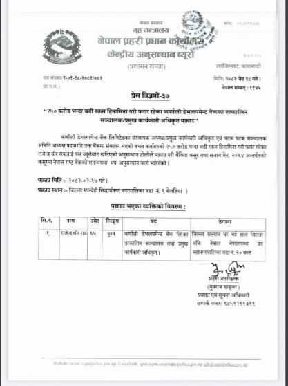 काठमाडौं । कर्णाली विकास बैंकमा रहेको बचतकर्ताको रकम हिनामिना गर्ने बैंकका संस्थापक अध्यक्ष तथा प्रमुख कार्यकारी अधिकृत राजेन्द्र वीर राय पक्राउ परेका छन् ।