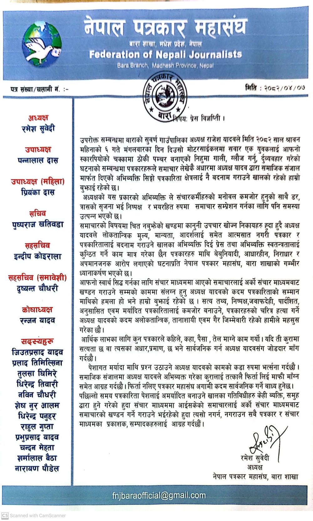सोही बिषय लिएर पत्रकारलाई लक्षित गर्दै अध्यक्ष यादवले दिएको सार्वजनिक अभिव्यक्तिले सम्पूर्ण पत्रकारिता क्षेत्रको अपमान गरेको महासंघको ठहर छ।