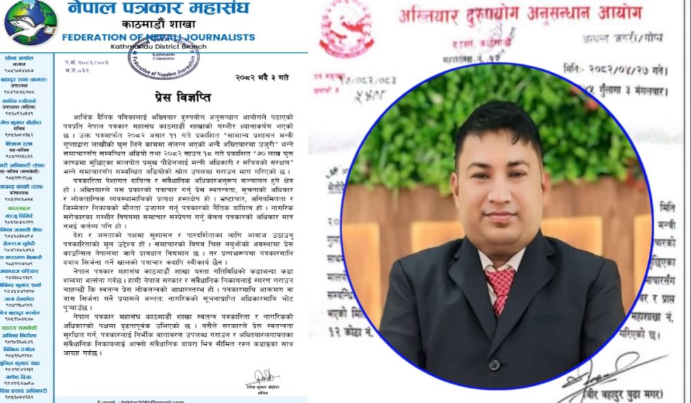 काठमाडौं । अख्तियार दुरुपयोग अनुसन्धान आयोगले आर्थिक दैनिक पत्रिकालाई पठाएको पत्रप्रति नेपाल पत्रकार महासंघ काठमाडौं शाखाले कडा आपत्ति जनाएको छ ।