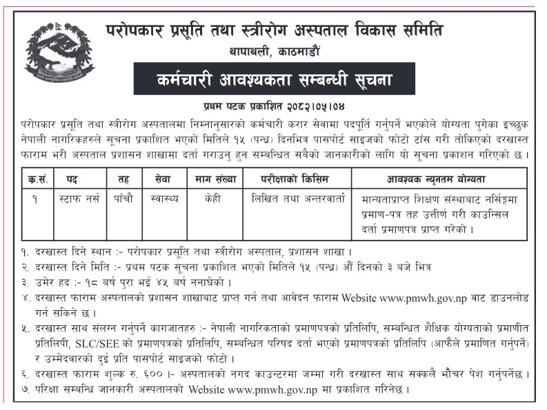 काठमाडौँको थापाथलीस्थित परोपकार प्रसूति तथा स्त्रीरोग अस्पताल (प्रसूति गृह) ले करार सेवामा स्टाफ नर्स पदका लागि दरखास्त आह्वान गरेको छ।