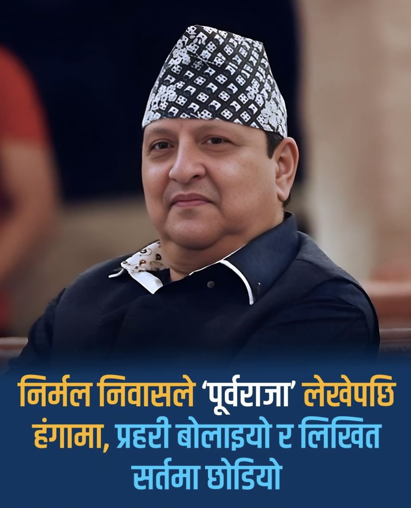 काठमाडौं — दसैंको शुभकामना सन्देशमा पहिलोपटक ‘पूर्वराजा’ शब्द प्रयोग भएपछि निर्मल निवास फेरि विवादमा परेको छ। संविधानले नचिनेको सम्बोधन प्रयोग गरेको आरोपमा प्रहरी समेत हस्तक्षेप गर्न बाध्य भएको खुलासा भएको छ।