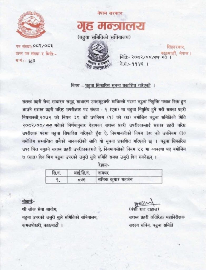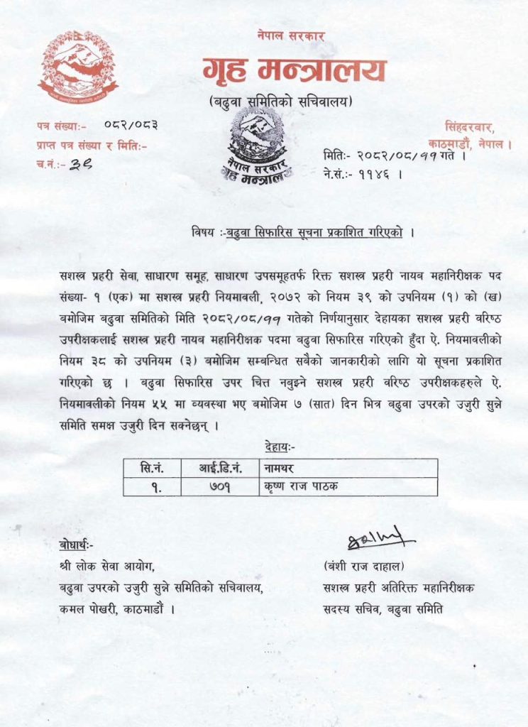सशस्त्र प्रहरी बलका दुई प्रहरी अधिकृतको बढुवा सिफारिस गरिएको छ। गृह मन्त्रालयको बढुवा समितिको निर्णय अनुसार सशस्त्र प्रहरी वरिष्ठ प्रहरी उपरीक्षक कृष्णराज पाठकलाई नायब महानिरीक्षक(DIG)मा र सशस्त्र प्रहरी उपरीक्षक समिक कुमार महर्जनलाई वरिष्ठ उपरीक्षक(SSP)मा बढुवा सिफारिस गरिएको हो।