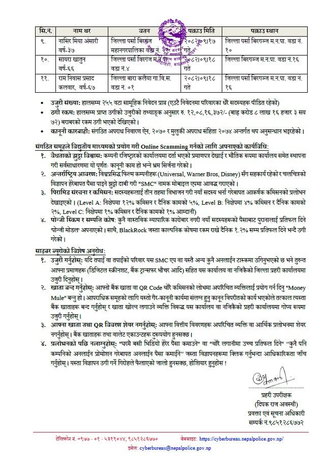 ब्युरोले घरमै बसी भिडिओ हेरेर पैसा कमाउने वा थोरै लगानीमा धेरै फाइदा हुने जस्ता लोभलाग्दा विज्ञापनको पछाडि नलाग्न सर्वसाधारणलाई सचेत गराएको छ।
