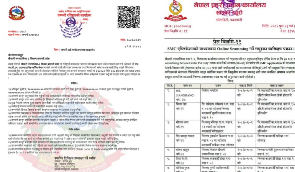 चितवनको खैरहनीमा ‘एस.एम.सी.एन. एड्भरटाइजिङ सर्भिस सेन्टर’ नामक कार्यालय खोलेर ‘SMC’ नामक मोबाइल एपमार्फत् उनीहरूले विभिन्न प्रलोभनमा पारी स्क्याम गर्ने गरेको एसपी दीपकराज अवस्थीले बताए ।