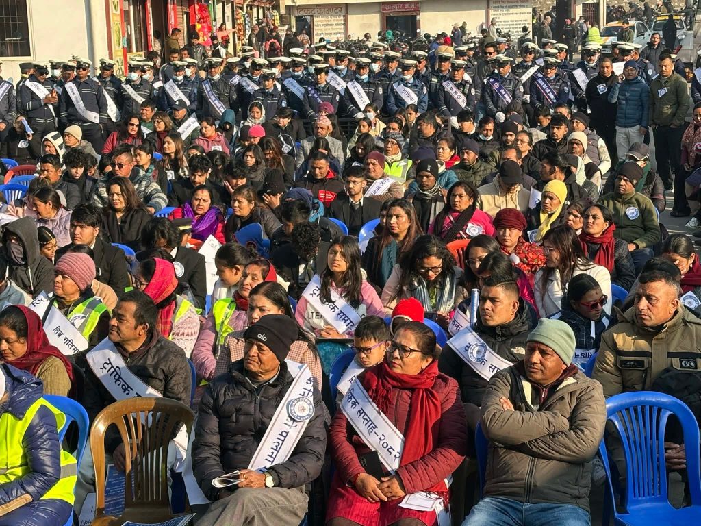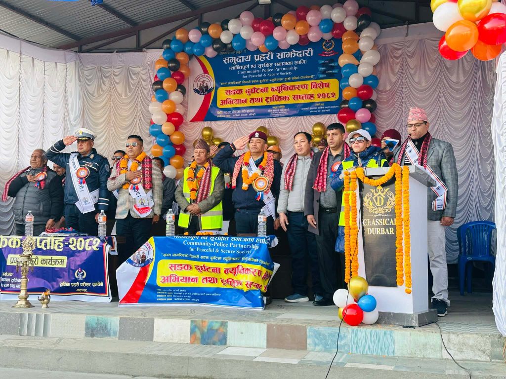काठमाडौं — सडक दुर्घटना न्यूनीकरण विशेष अभियान तथा ट्राफिक सप्ताह–२०८२ को अवसरमा आज बुधबार काठमाडौंको कोटेश्वर–जडिबुटी क्षेत्रमा सचेतनामूलक प्रभातफेरी तथा र्याली कार्यक्रम सम्पन्न भएको छ। “समुदाय–प्रहरी साझेदारी कार्यक्रम” अन्तर्गत ‘हाम्रो प्रहरी’ अभियानका रूपमा आयोजना गरिएको उक्त कार्यक्रम सामुदायिक सेवा तथा विकास समाज, सामुदायिक प्रहरी सेवा केन्द्र कोटेश्वर–३२, ट्राफिक प्रहरी प्रभाग कोटेश्वर, प्रहरी प्रभाग कोटेश्वर र काठमाडौं उपत्यका ट्राफिक प्रहरी कार्यालय रामशाहपथको संयुक्त आयोजनामा सम्पन्न भएको हो।
