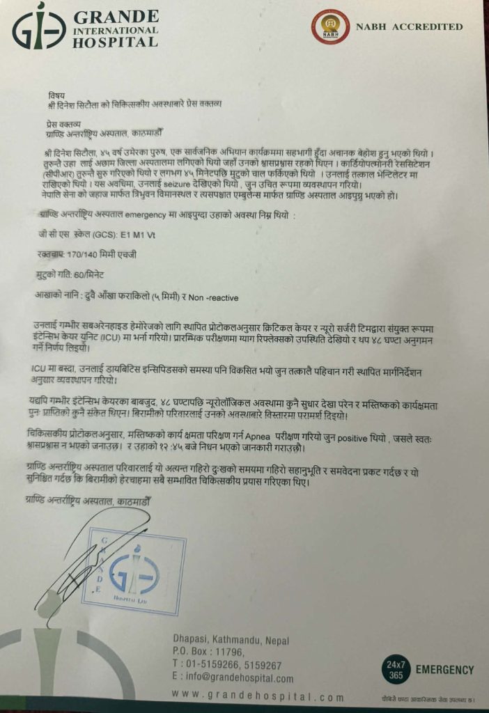 अस्पतालले जारी गरेको विज्ञप्तिमा उल्लेख गरिएअनुसार सघन उपचार कक्षमा राखेर ४८ घण्टासम्म उपचार गरिए पनि उनको न्यूरोलोजिकल अवस्थामा कुनै सुधार देखिएन। मस्तिष्कको कार्यक्षमता फर्कने कुनै संकेत नदेखिएपछि चिकित्सकीय प्रोटोकलअनुसार एप्निया परीक्षण गरिएको थियो, जसको नतिजा पोजेटिभ आएको र स्वतः श्वासप्रश्वास नभएको पुष्टि भएको अस्पतालले जनाएको छ। त्यसपछि आज दिउँसो १२:४५ बजे उनको निधन भएको घोषणा गरिएको हो।