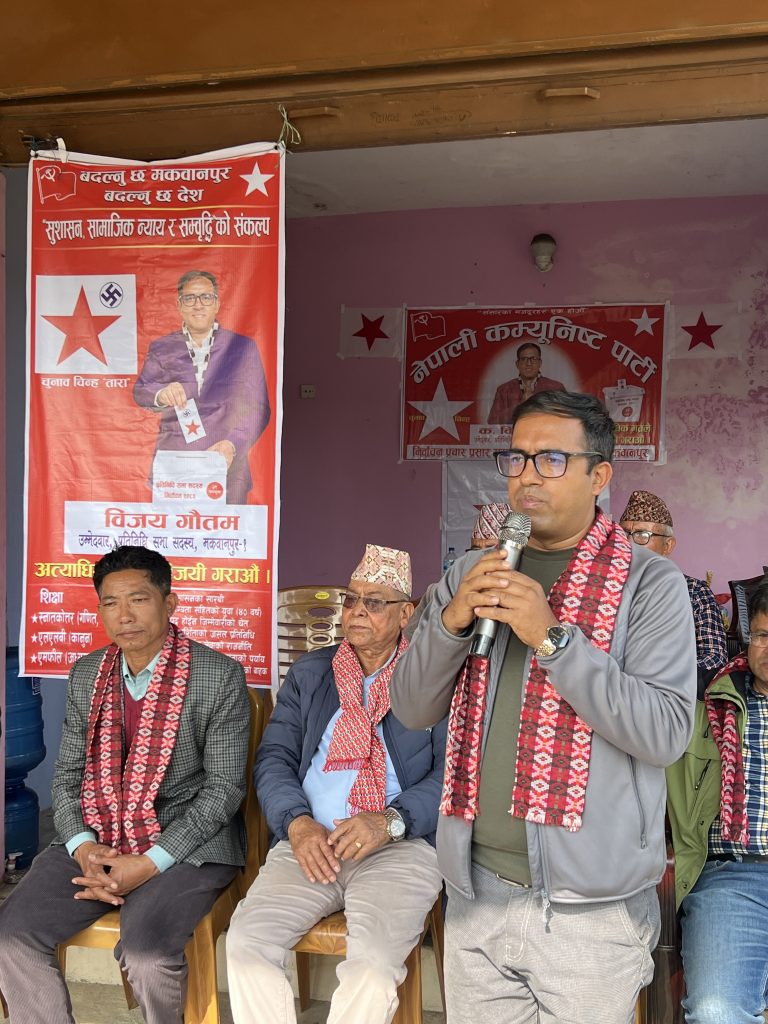 कार्यक्रमलाई सम्बोधन गर्दै मकवानपुर जिल्ला निर्वाचन क्षेत्र नम्बर–१ बाट नेपाली कम्युनिष्ट पार्टीका उम्मेदवार विजय गौतमले यस निर्वाचनलाई साधारण जित–हारको प्रतिस्पर्धा नभई वडा, क्षेत्र र देश परिवर्तन गर्ने अभियानको रूपमा चित्रण गरे। “हामी साँचो र मानका लागि मैदानमा छौँ। यो परिवर्तनको अभियान हो, त्यसैले घर–घरमा पुगेर यो सन्देश फैलाउन आवश्यक छ,” उनले भने।