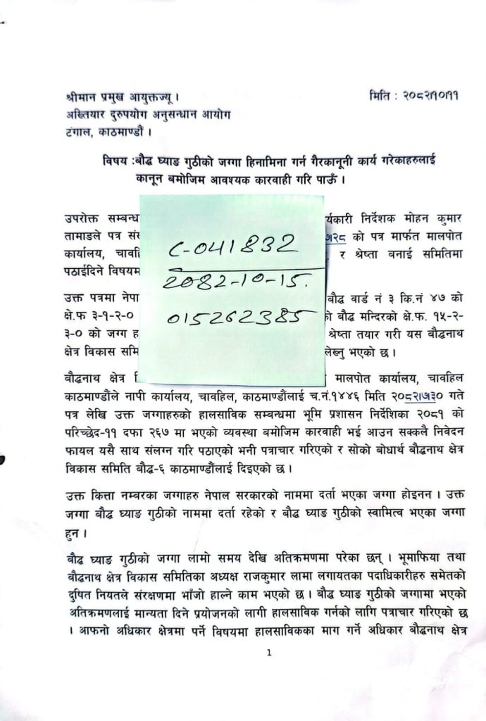 बौद्ध घ्याङ गुठीको जग्गा हिनामिना गर्न गैरकानुनी कार्य गरेको भन्दै कानुन वमोजिम कारवाहीको माग गरिएको उल्लेख छ ।
