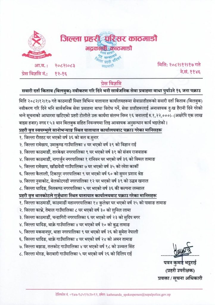 मिति २०८२ चैत १७ गते दिउँसो १२:१५ बजे सार्वजनिक सेवा प्रवाहमा अवरोध पुर्याउँदै अवैध रूपमा रकम असुलिरहेको सूचनाका आधारमा खटिएको प्रहरी टोलीले उनीहरूलाई नियन्त्रणमा लिएको हो। पक्राउ परेकाबाट नगद रु. १ लाख २२ हजार र ५३ थान सवारी दर्ता किताब (बिलबुक) बरामद गरिएको प्रहरीले जनाएको छ।