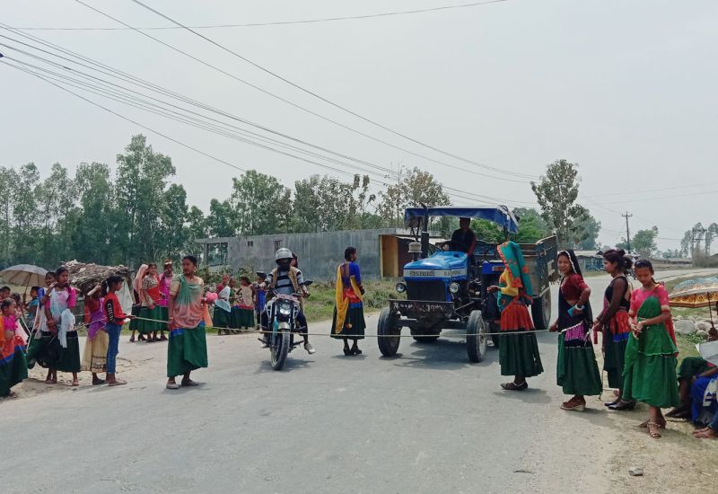 बाटो छेकेर पैसा उठाउँदै थारु महिला