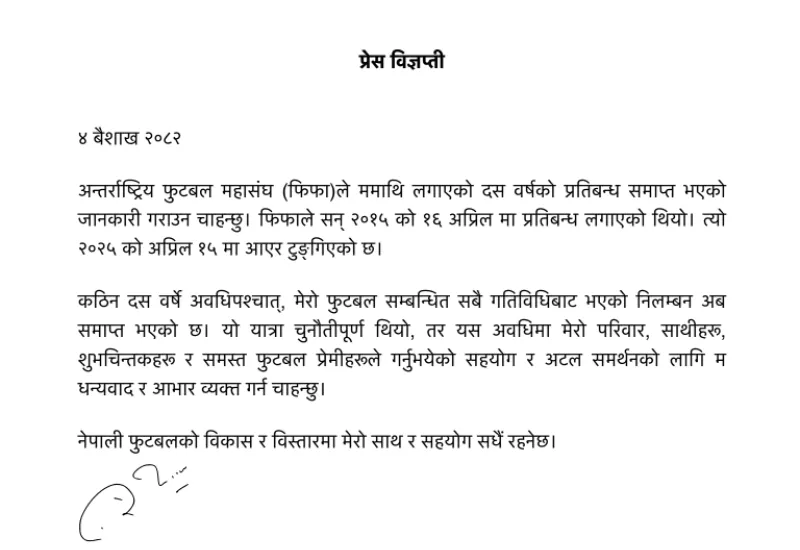 गणेश थापा माथीको १० बर्षे प्रतिबन्ध फुकुवा, भन्छन्, ‘अब फेरी फुटबलको बिकासमा लाग्छु’